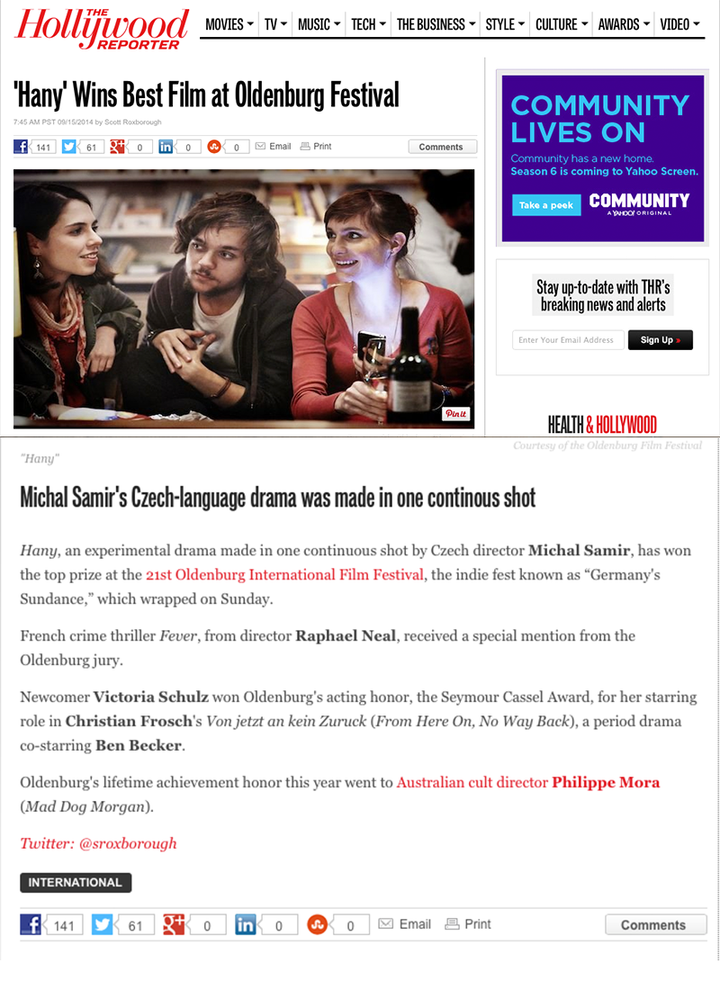 Experimentálna dráma HANY zožala úspech aj v Nemecku. Najnovšie totiž získala hlavnú cenu na 21. Medzinárodnom filmovom festivale v Oldenburgu, známom tiež ako “Germany's Sundance”. V rámci festivalu boli ocenení tiež Francúzi so snímkou Fever a cenu za celoživotné dielo putovalo do rúk kultovému austrálskemu režisérovi, Philippemu Moraovi.