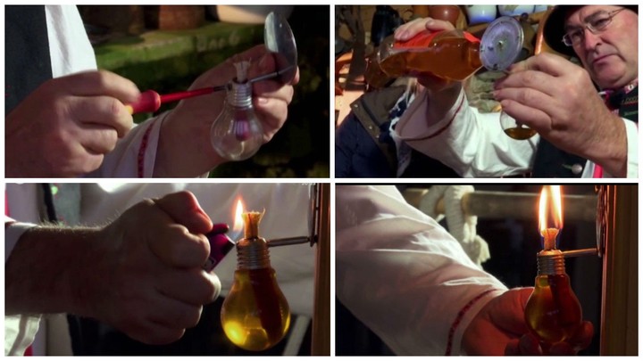 Najprv si opatrne odpíľte vrch objímky, aby ste sa dostali do vnútra žiarovky. Keď sa vám to podarí, skrutkovačom vylomte svetelné zariadenie a cez vytvorenú dierku ho vysypte von. Vŕtačkou vyvŕtajte vo vrchnej polovici objímky diery na oboch stranách. Neskôr budú slúžiť na upevnenie skrutkou. Pripravte si kovovú trubičku a tiež do nej navŕtajte dve dierky oproti sebe. Do takto upravenej trubičky zasuňte knôt a napokon celú trubičku vložte do žiarovky. Trubičku a objímku zoskrutkujte. Potom si pripravte kovový pliešok, do ktorého taktiež navŕtajte dierku. Zoskrutkujte spolu pliešok a žiarovku s trubičkou. Na záver nalejte do žiarovky lampový olej a zapáľte knôt. Hotovo! Originálna lampa je na svete.