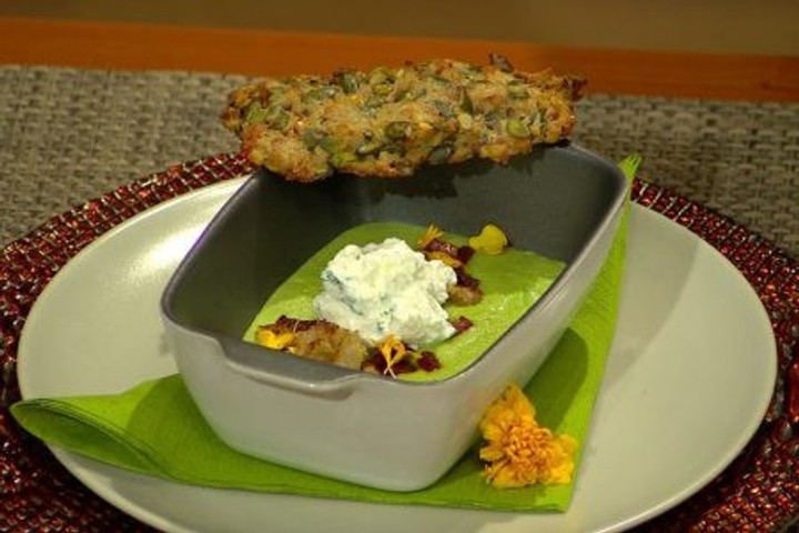 Servírujte! Či už použijete vydlabaný bochník, alebo ľubovoľný tanier, na teplú polievku nasypte striedku so slaninou, uložte lyžicu ochutenej ricotty, priložte chlebíčky z trúby a dozdobte jedlými kvetmi.