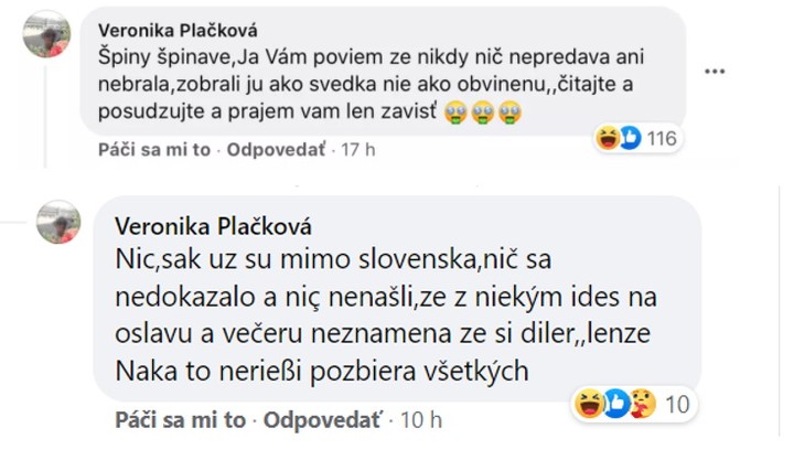 Kým väčšina ľudí sa jej teraz vysmieva, našli sa aj takí, ktorí sa postavili na jej obranu. Medzi nimi je práve Plačkovej mama Veronika! Tá sa do neprajníkov pustila na facebookovej stránke Nákupné maniačky a na hejteroch nenechala nitku suchú. "Špiny špinavé, ja vám poviem, že nikdy nič nepredávala ani nebrala. Zobrali ju ako svedka, nie ako obvinenú, čítajte a posudzujte a prajem vám len závisť," nechala sa počuť Veronika a pokračovala: "Nič sa nedokázalo a nič nenašli...že s niekým ideš na oslavu a večeru, neznamená, že si díler... NAKA to nerieši a pozbiera všetkých," dodala.