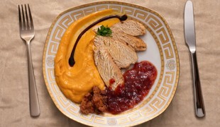 Kuracie prsia s batátovo-zemiakovým pyré a mangovo-brusnicovou omáčkou