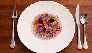 Tatarák zo srnca, krém z olomouckého syra a brusnicový gél